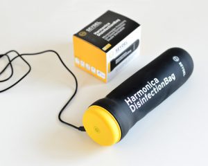 除菌バッグの中にハーモニカを入れマイクロUSBをつなぎ電源ボタンを押すと除菌が開始されます。