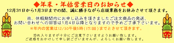 12月31日から1月3日まで店頭業務をお休みさせていただきます。