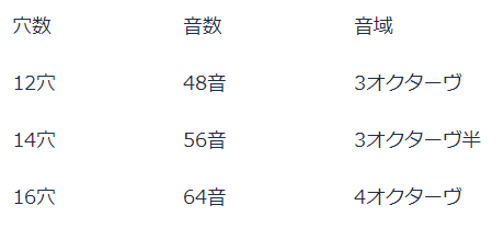 12穴と比べて16穴は低音側に1オクターヴ広いので、低音域を吹いた際の音の広がりがより感じられます。