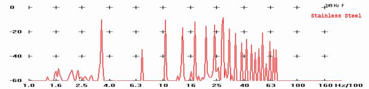 ステンレスリードは1,600Hz~4,000Hz(グラフ横軸の16~40)でより多くの倍音を含んでいます。