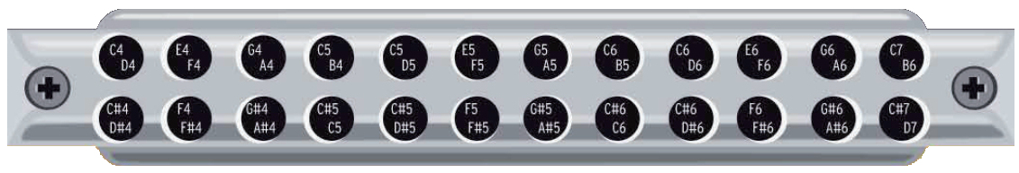 上下2列の上側がC、下側がC#です。片側ずつ演奏します。