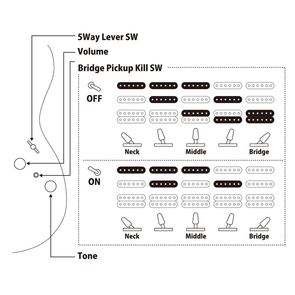 ピックアップは、OS用にチューニングされたホットなハムバッカーとトラディショナルなサウンドを追求したシングルコイルをダイレクトマウント。デフォルトでリアとフロントを鳴らすカスタム配線が実装されてるほか、スイッチング奏法を再現したトリッキー・スイッチもSPOTモデルの限定仕様。