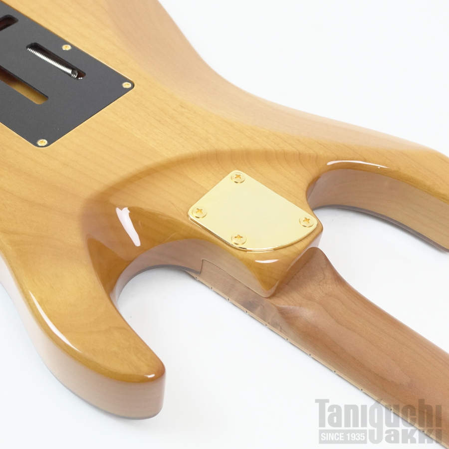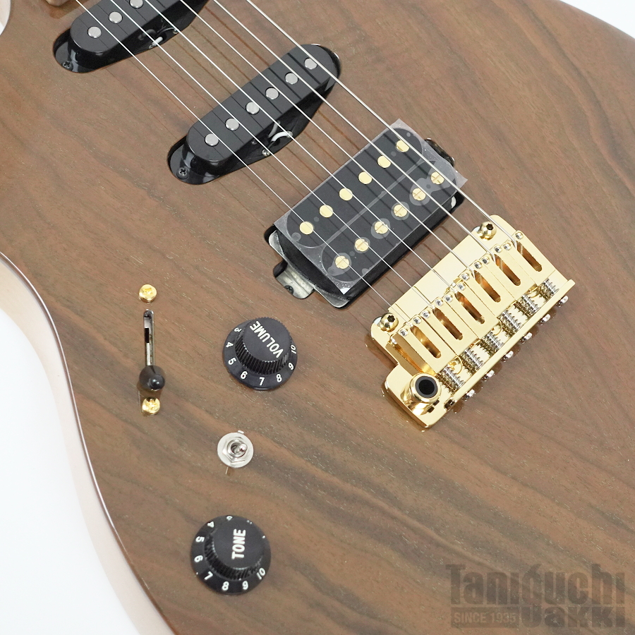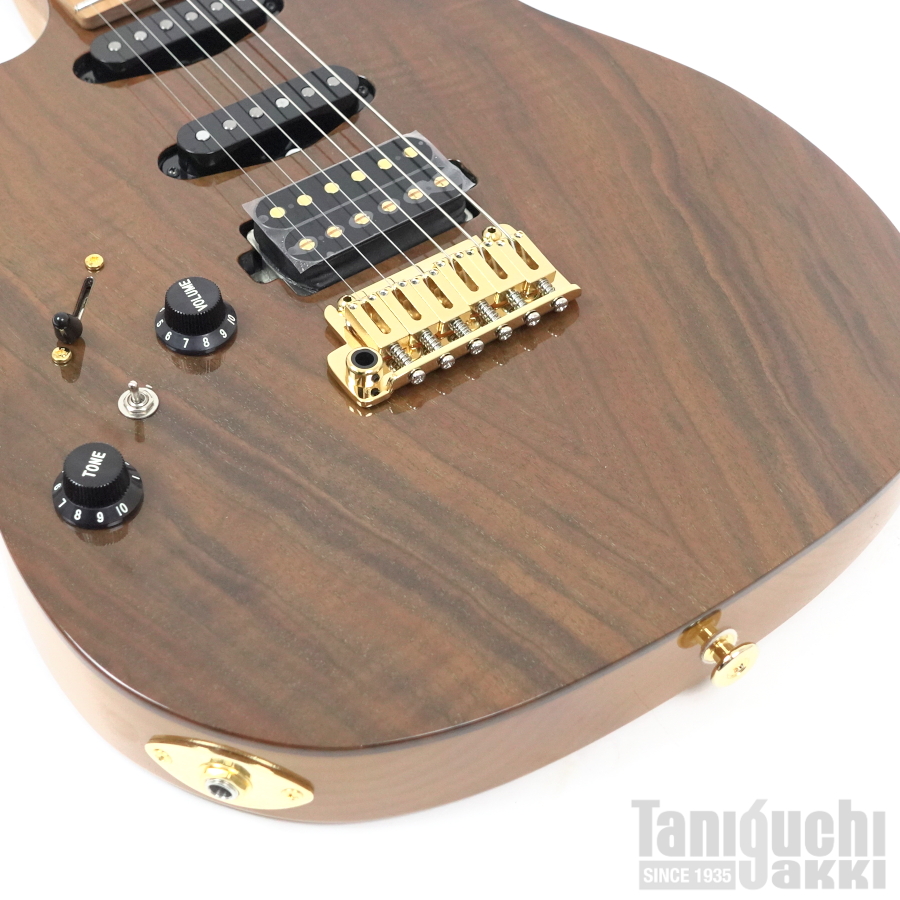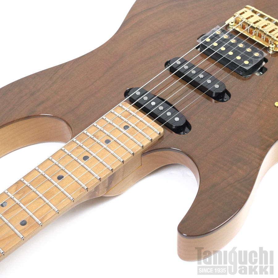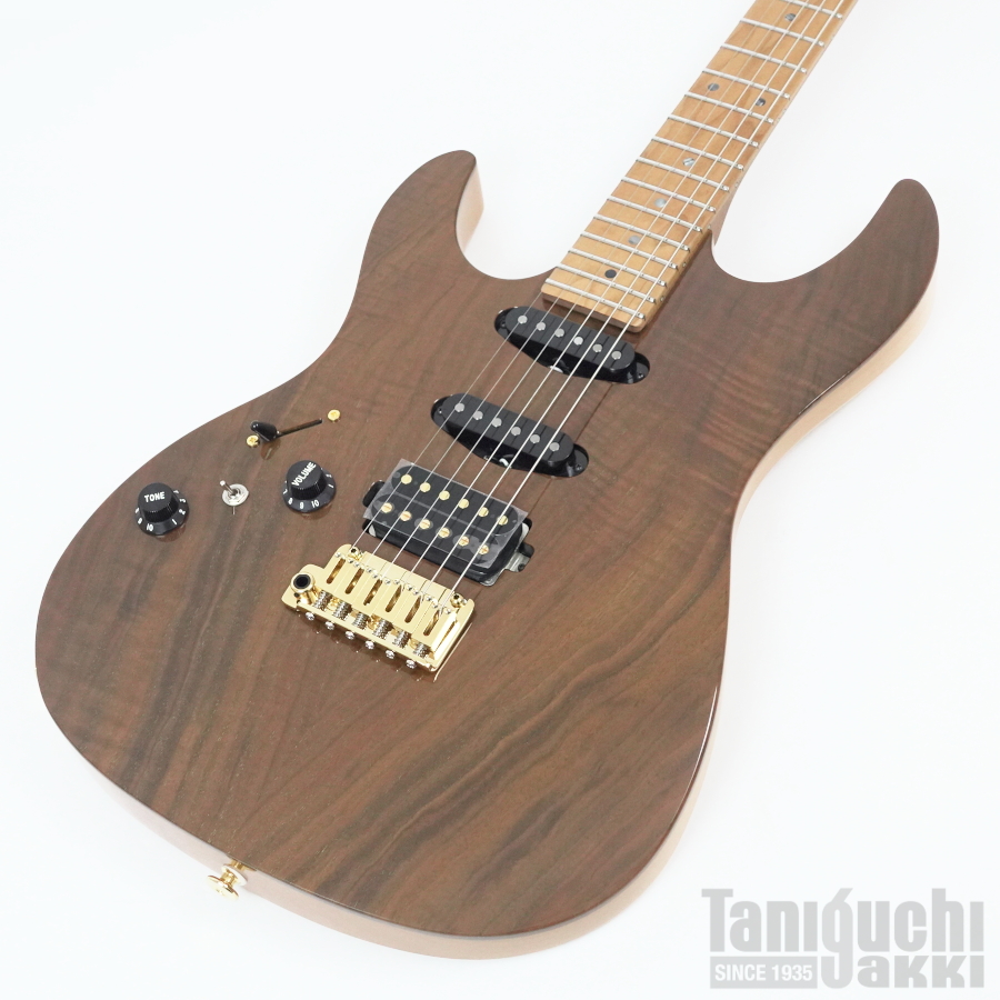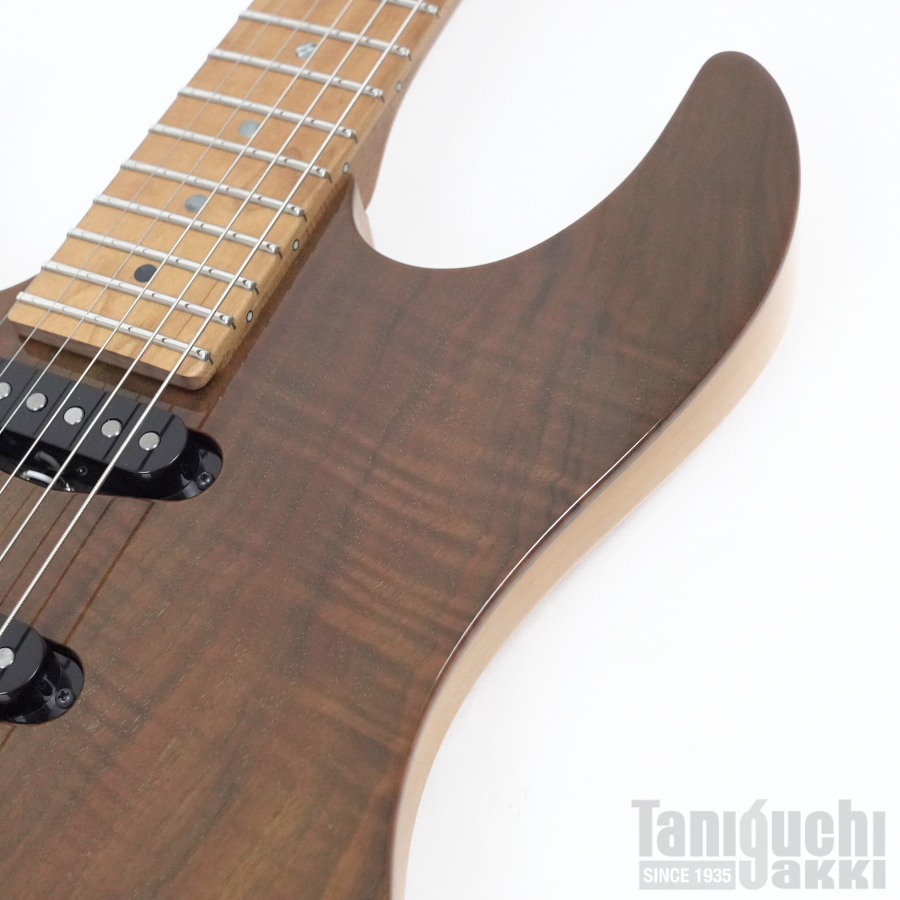 ボディバックにアルダー、トップにクラロウォルナット、ネックと指板にローステッド・メイプルを使用。ノンピックガードで杢目を大胆に魅せるエキゾチックなルックスが印象的です。