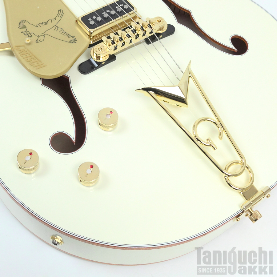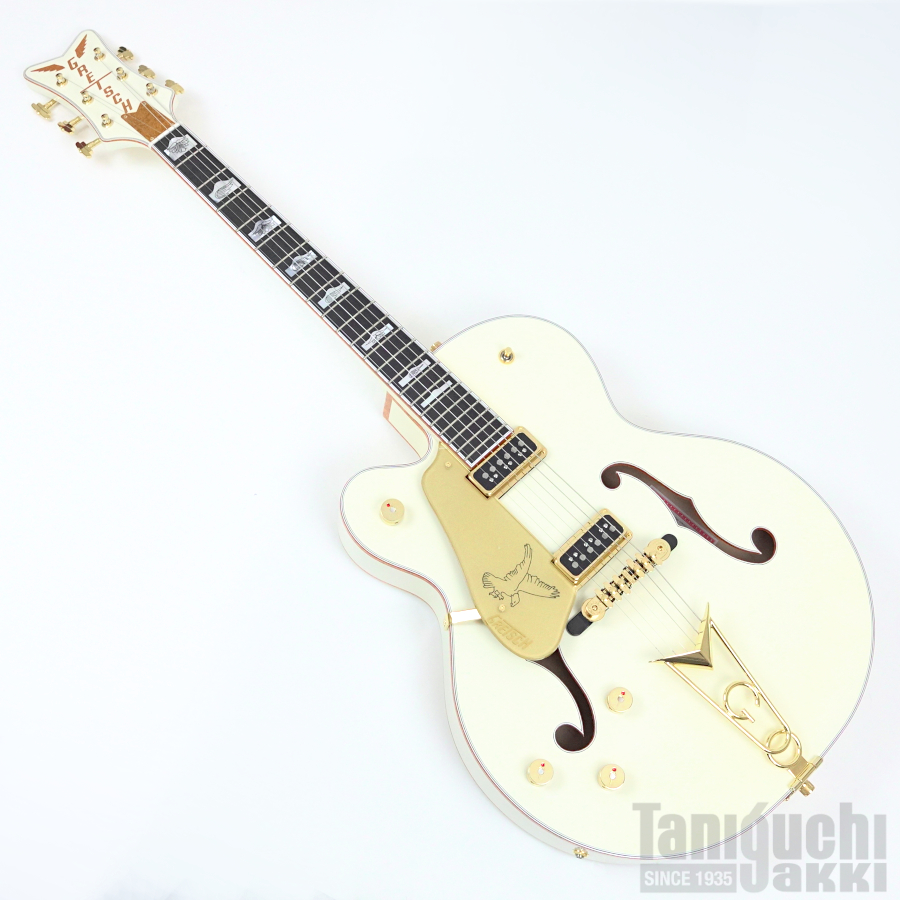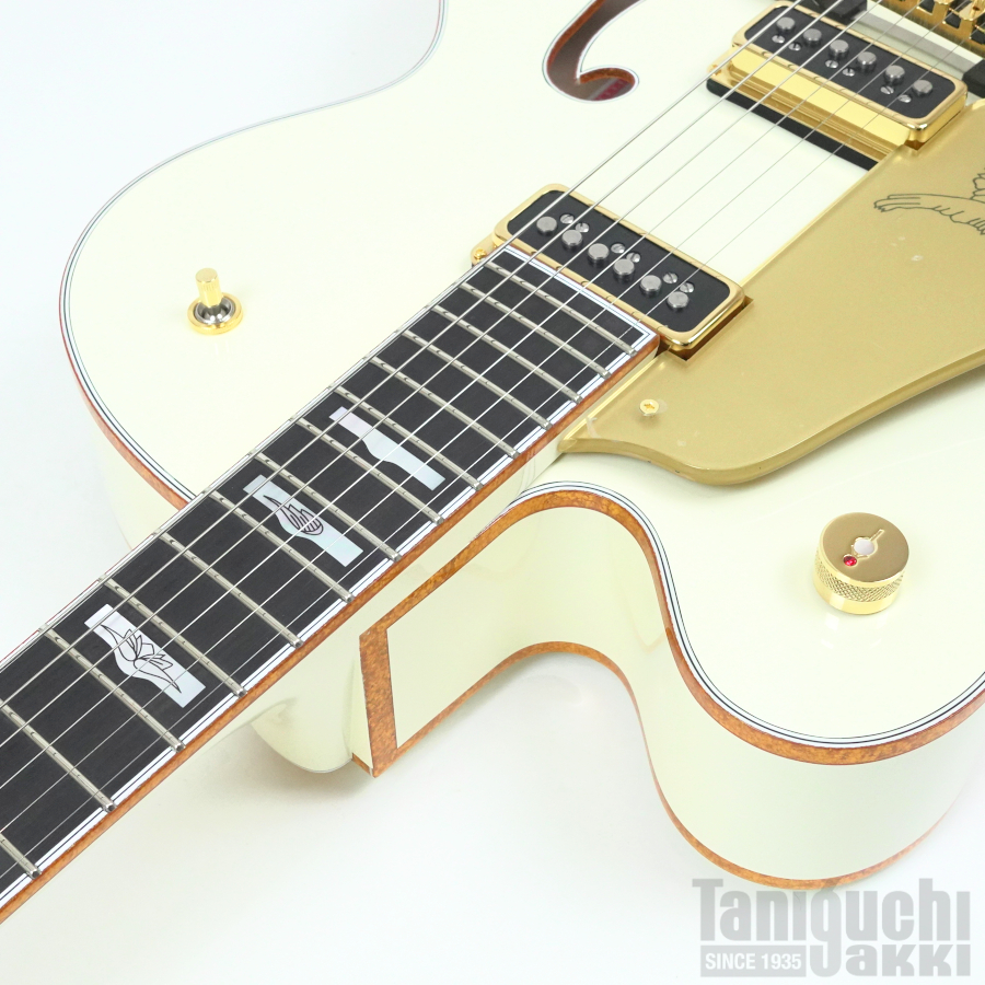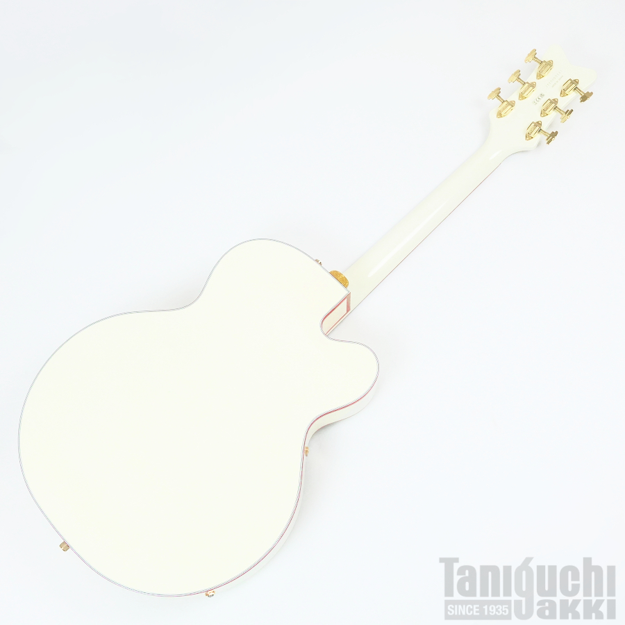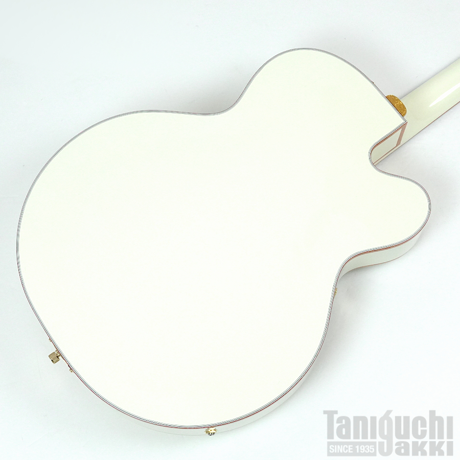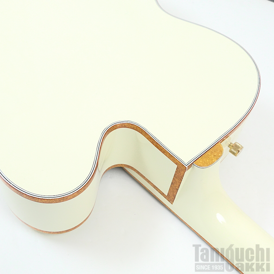ヴィンテージ・ホワイトで仕上げたボディのサイズ感はグレッチで最も大きい17インチ幅、2,75インチ(約70mm)厚。ソリッド・スプルース、メイプルで構成されるホロウボディ内部にはパラレル・トーンバー・ブレーシングを備えています。
