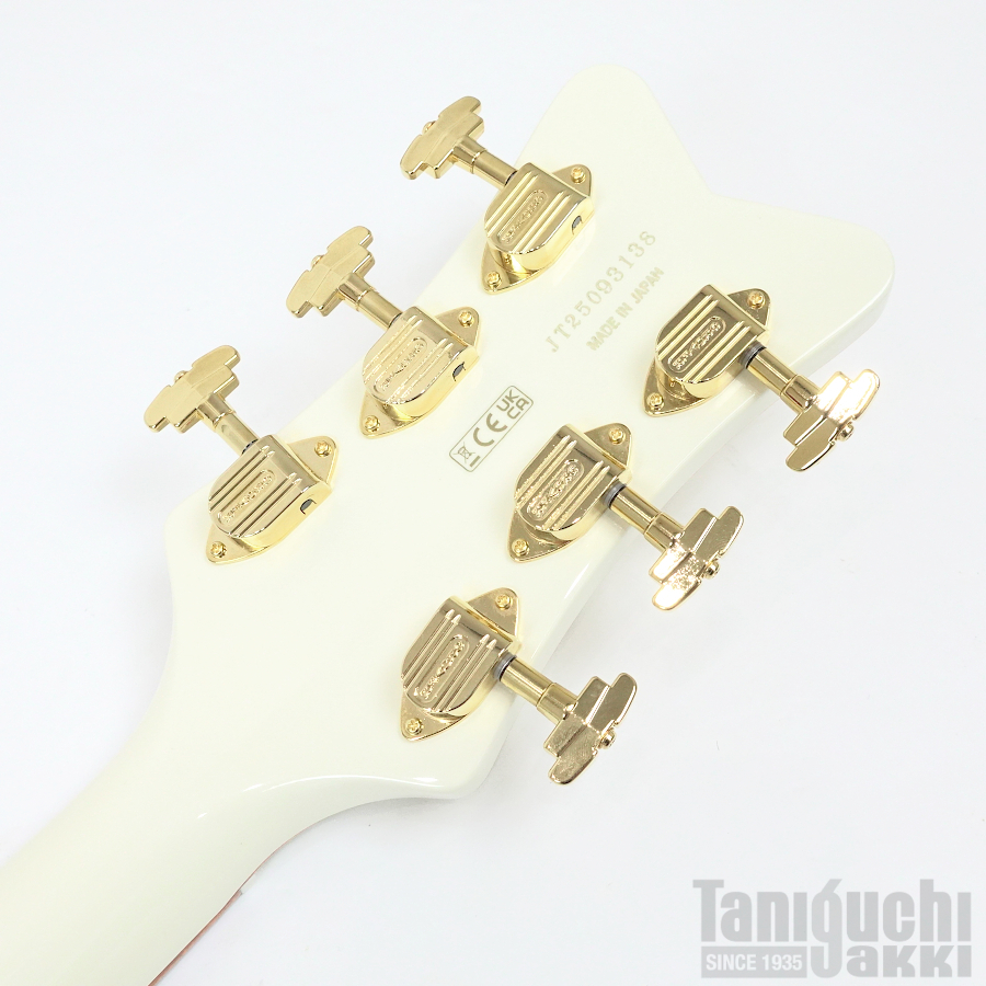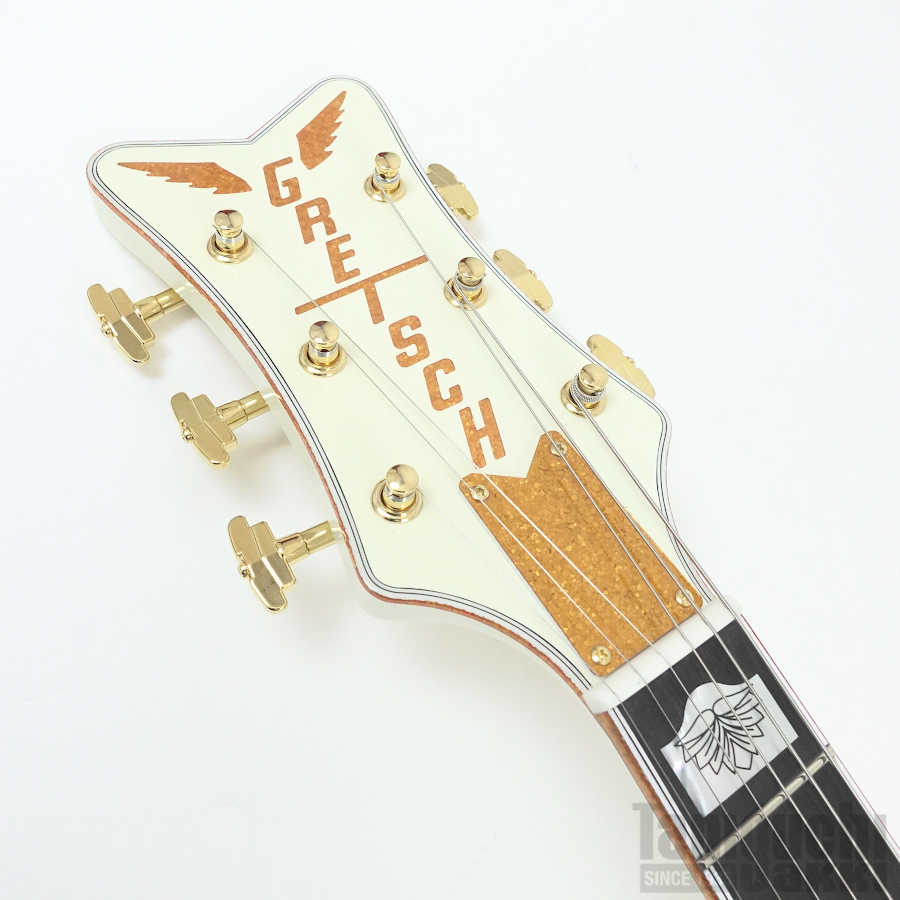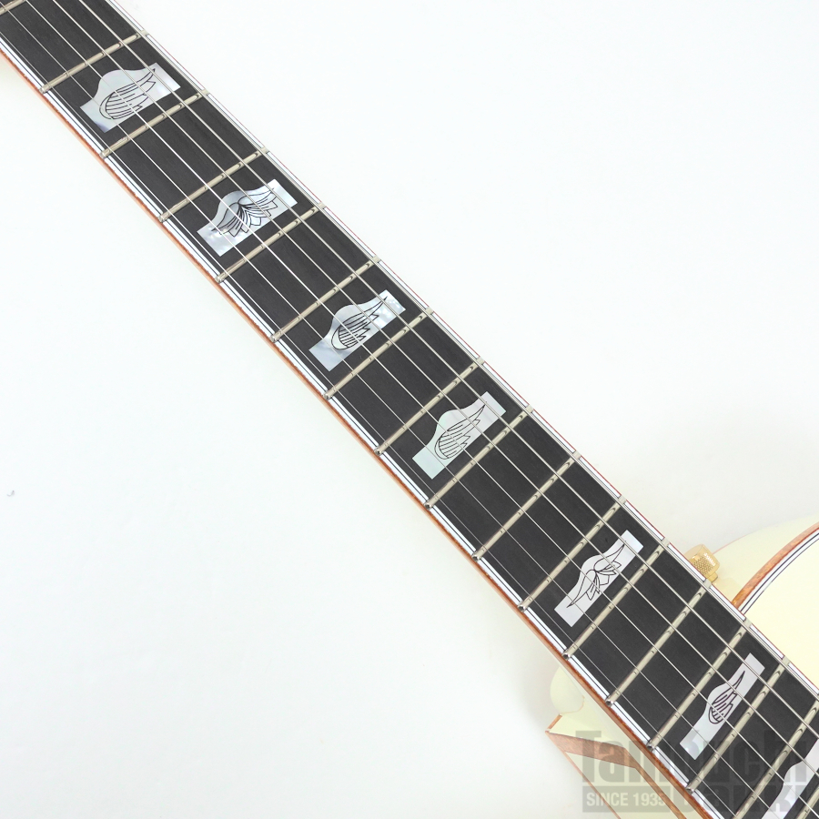 ネックは馴染みやすいUシェイプ。12インチ(305R)ラディアスのエボニー指板にはフェザー・モチーフのハンプブロック・インレイをインストール。その他T-Armondシングルコイルピックアップ、オリジナルモデルのスタイリングを追求したSynchro-Sonicブリッジ、キャデラック"G"テールピース、Groverインペリアル・チューナーといった55年型ホワイト・ファルコンの象徴的な仕様もしっかりと踏襲。ゴールドスパークルのド派手トラスロッドカバー、羽付きのバーチカルロゴを備えたV型ヘッドストックも秀逸です。