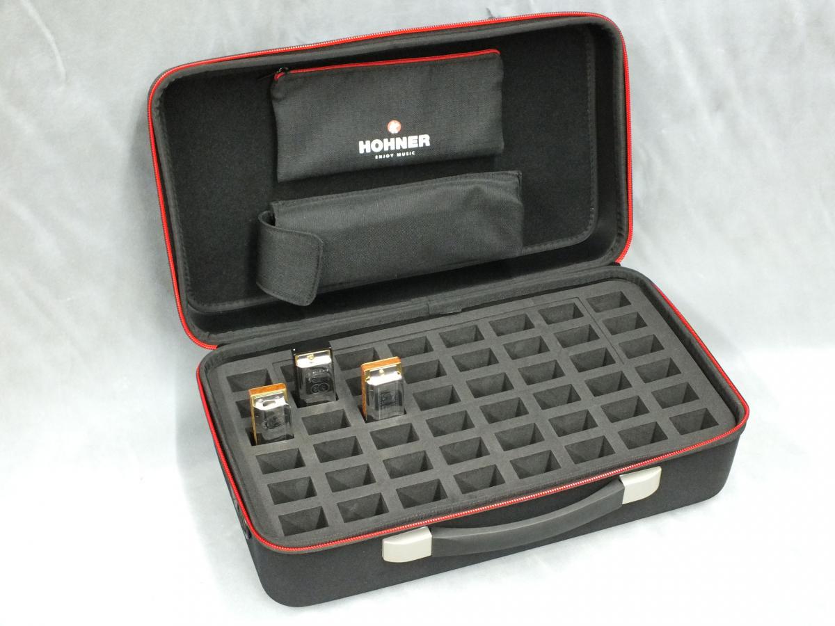 HOHNER製10ホールズ48本入りケースです。 10ホールズ48本、12穴クロマチックハーモニカを2本、16穴クロマチックハーモニカ1本、ボーカルマイク1本、バレットマイク1本、修理キットを収納可能です。