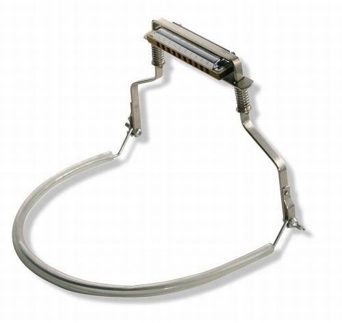 SUZUKIの10穴ハーモニカホルダーは従来式とは違い、両サイドのゴムでハーモニカをがっちり固定します。