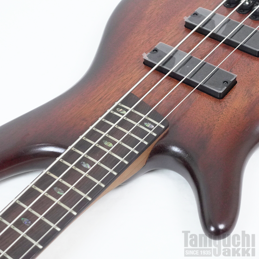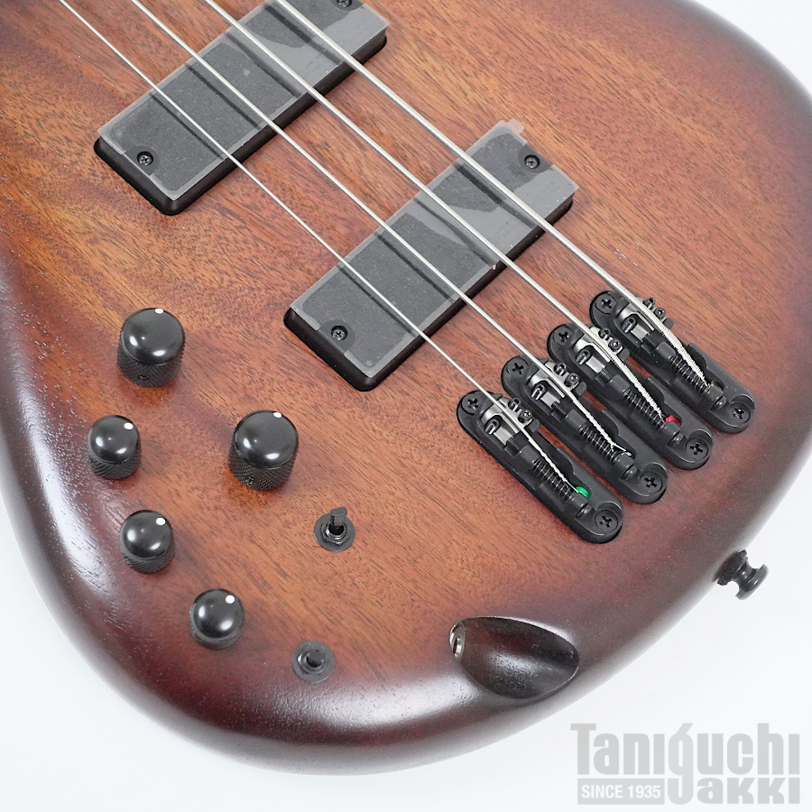 ピックアップはタイトなボトム・エンドと豊かなミッドレンジに定評のあるBartolini BH2、プリアンプはワイド・レンジ&低ノイズのIbanez Custom Electronics 3-band EQを搭載。スイッチ切り替えにより、中音域の周波数帯を250Hz、450Hz、700Hzに切り替えることも可能。さらにEQバイパス・スイッチを装備しており、パッシブ・ベースとしても使用可能です。(バイパス時はTrebleノブがトーン・コントロールとして機能します)