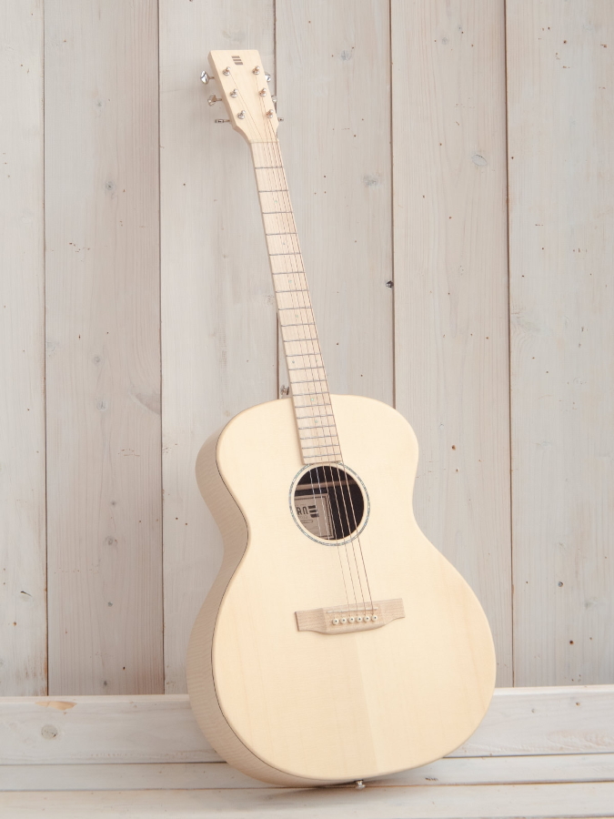ボディサイズはコンパクトなグランドオーディトリアムを基本に、やや薄めのボディ厚に設計。トップ材は高級アコースティックギターのトーンウッドとしても使用されるイングルマン・スプルース単板、サイド&バック材はメイプルをセレクト。表板と側板の接合部にはバインディングを巻かず、角を丸めて抱えた際の摩擦を和らげる処理を施しています。