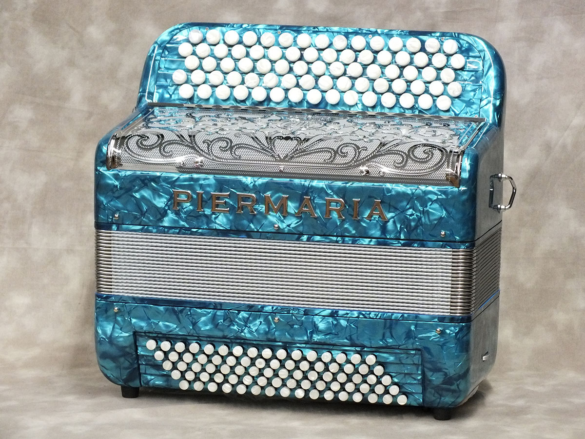 鮮やかなカラーバリエーションが人気の“ピエールマリア” こちらは47音/80ベースを備えながらも軽量で、ボタンアコーディオンとしても操作性の高い人気のモデルになります。