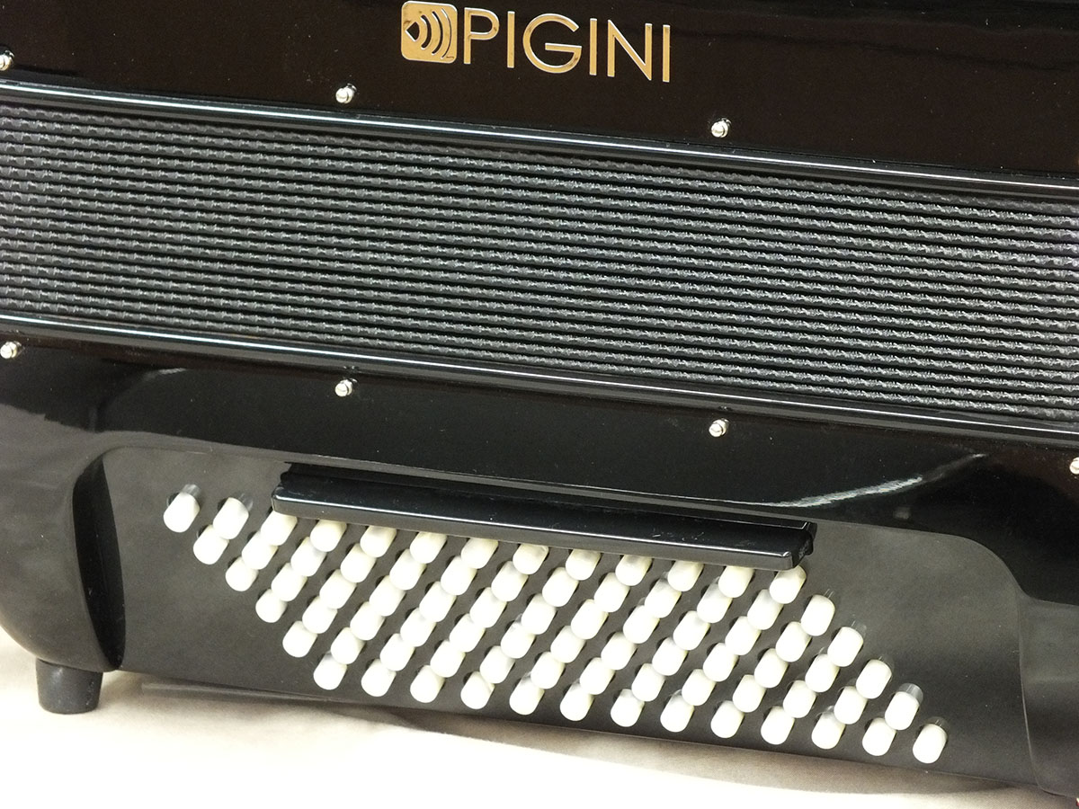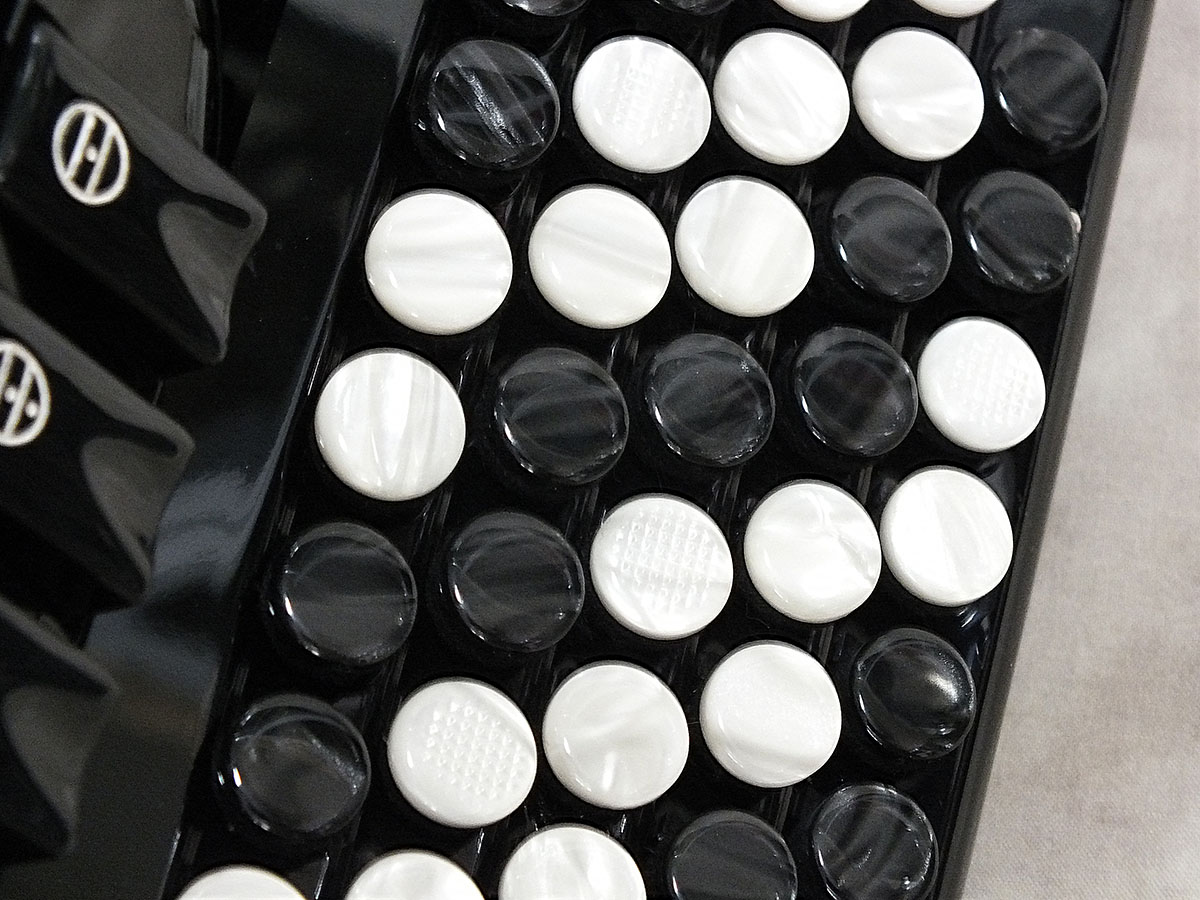 フリーベースは37音(C~C)、右手ボタンは61ボタン37音(G~G)、2枚リードで小型ながらも幅広い楽曲に対応出来るスペックを有するモデルです。