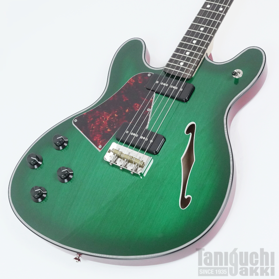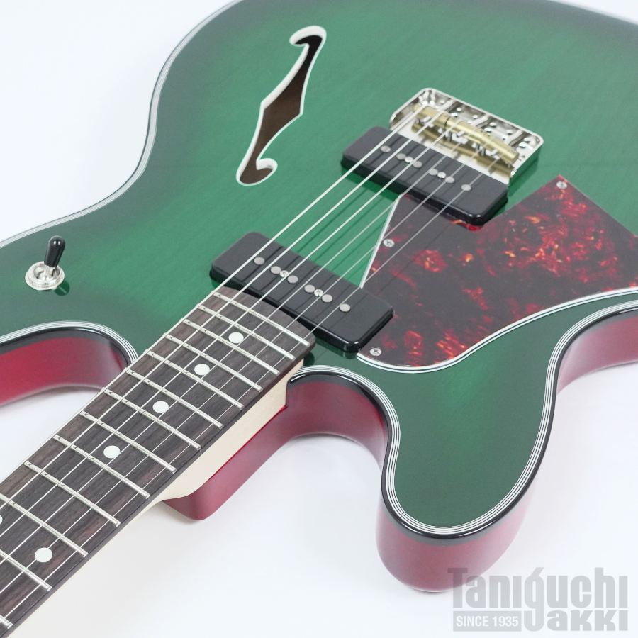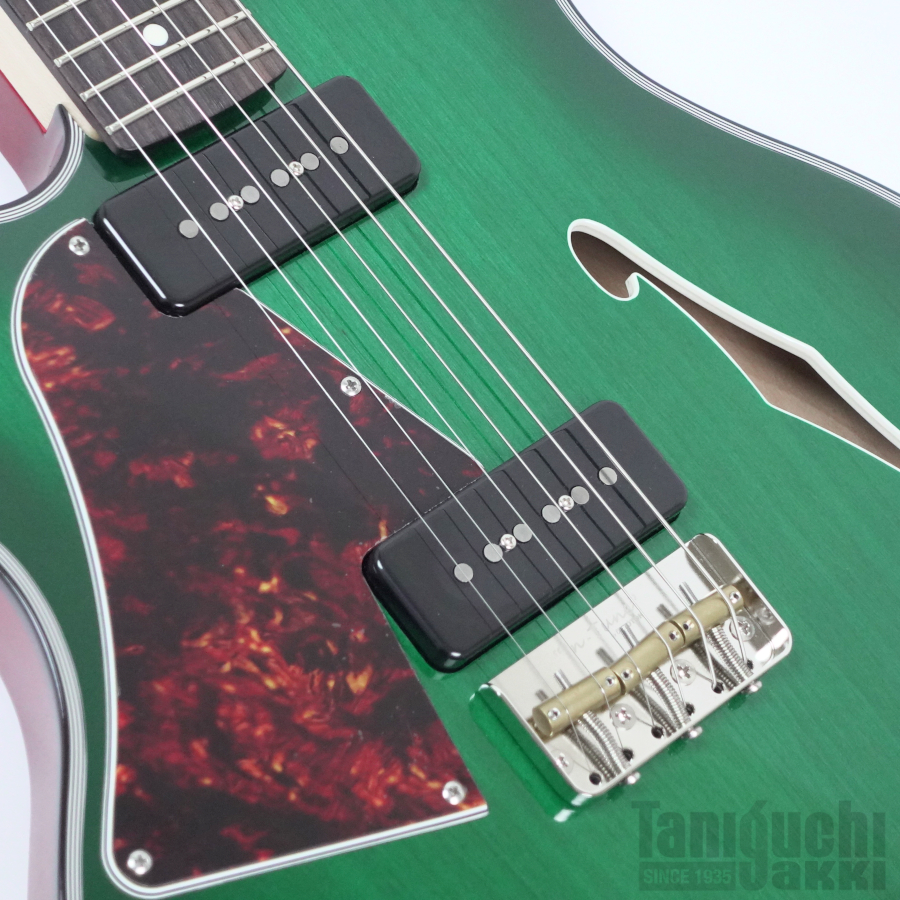 ピックアップは、サイケデリズムが長年に渡って採用を続ける Porter Pickups USAの“A90”を搭載。ハイゲインでも濁りのない明瞭なトーンを持ち味とし、ボリュームを絞れば程よく歪んだ軽快なクランチも出力可能。ビルダーの感性で厳選した国内外の拘りパーツを組み込んだテレキャスタータイプ、ジャズマスタータイプを得意とする同社ですが、ホロウボディでもサイケの得意とする「コード感を損なわないヌケの良さ」をしっかりと体現しています。コントロールも 2Volume、2Tone になっていますので、フロントとリアでサウンド・キャラクターの使い分けもしやすいかと思います。