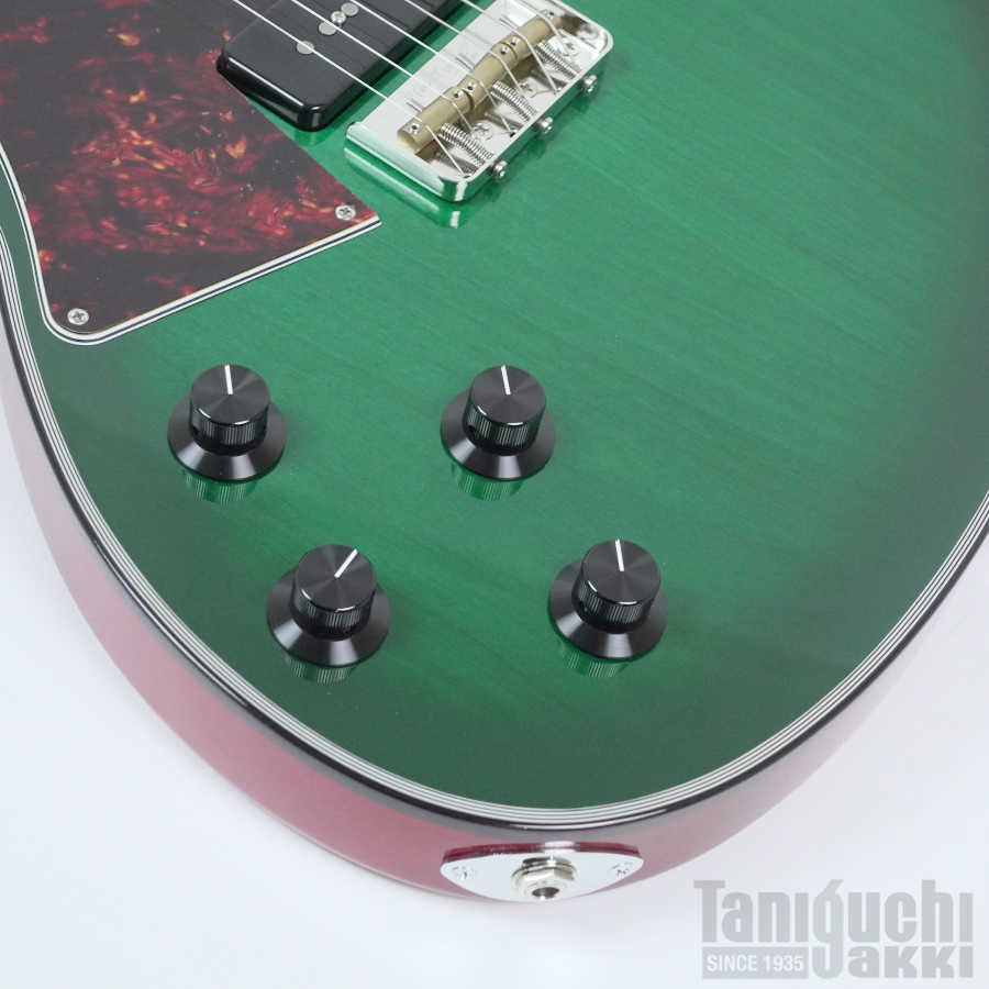 市場で見かけることが少ないカラーリングも特筆。本個体はトップの中心部をシースルー・グリーン、外周を濃いめのメタリック・グリーンでバーストさせ、バインディングを境にサイドとバックをシースルー・レッドでフィニッシュ。ピックガードにベッコウ柄を合わせた個性的な1本です。