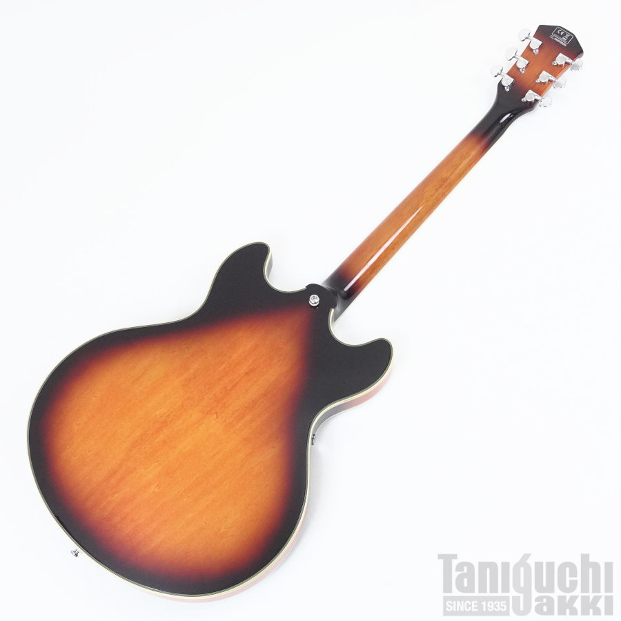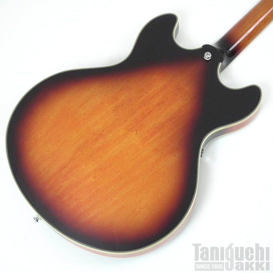 本機はトップ・サイド・バック(センターブロック)にメイプルを使用したボディに、43mmナットのマホガニーネックをセットしたセミアコースティック・モデル。エボニーフィンガーボードの指板RとスケールはGibsonギターと同じく12インチラジアス、628mm(ミディアム)スケールを踏襲。指板サイドには Sireならではの意匠「Rolled Fretboard Edges」を取り入れ、スムースなグリップを実現しています。