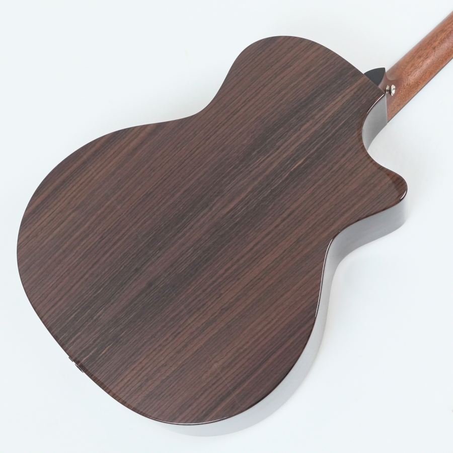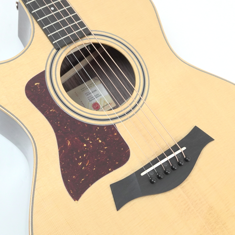 トップは熱処理による独自の木材乾燥を施したトレファクション・スプルース、サイド&バックはローズウッドを使用したオール単板ボディ。ネック材はマホガニー。ナット幅は100および200シリーズ同様の42.8mm。通常の314ceよりも約2mm狭い設計となっており、エレキギター奏者にも親しみやすいスレンダーなネック・シェイプが特徴です。