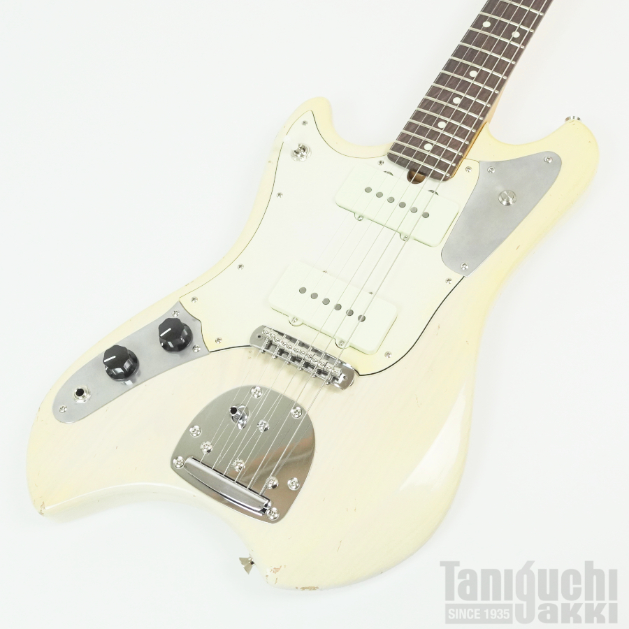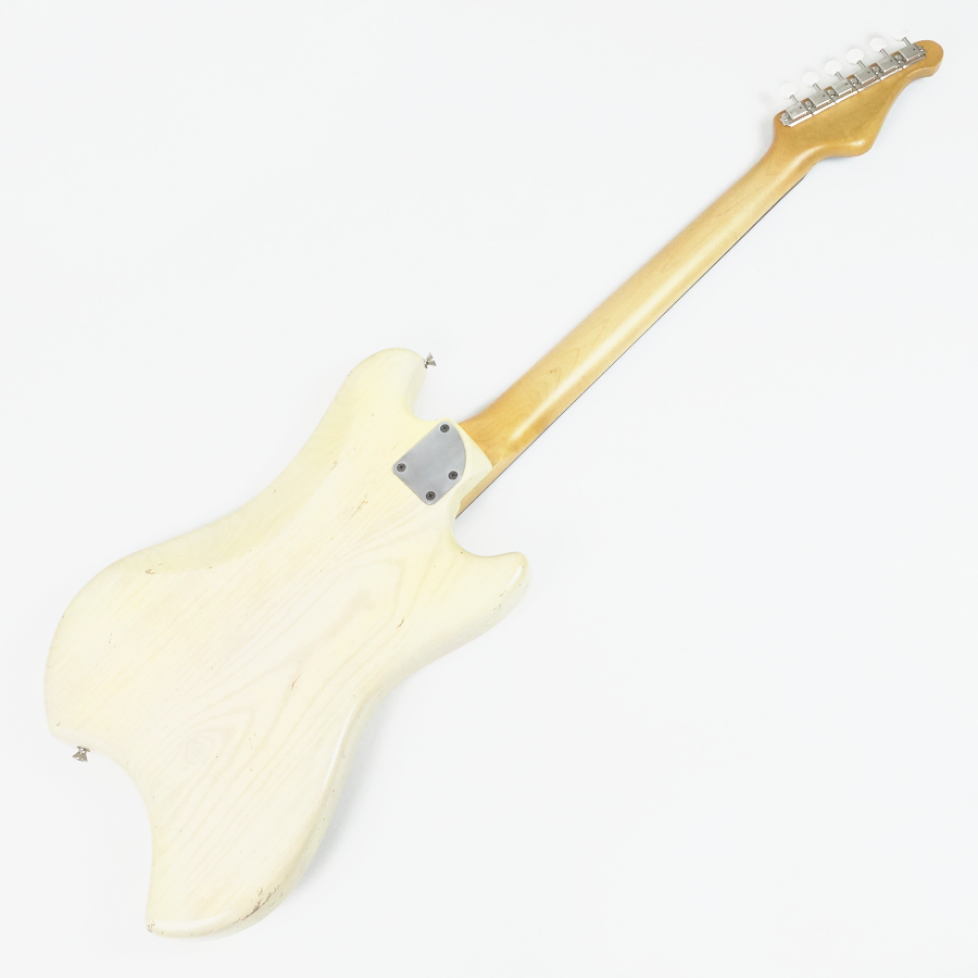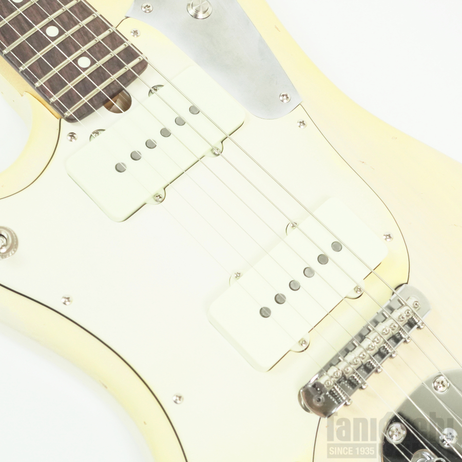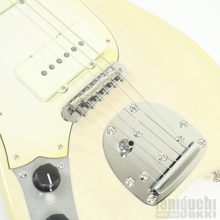 本機は ジャズマスターPUとフローティング・トレモロ+ムスタング・タイプのブリッジ・サドルをフィーチュアした1本。ボディはライトアッシュ。長い時を経て黄変したかのようなブロンド・カラーに合わせて、ピックガードにも経年による色焼けを再現。程よいエイジド加工も相まったヴィンテージギターのような風合いがクールです。