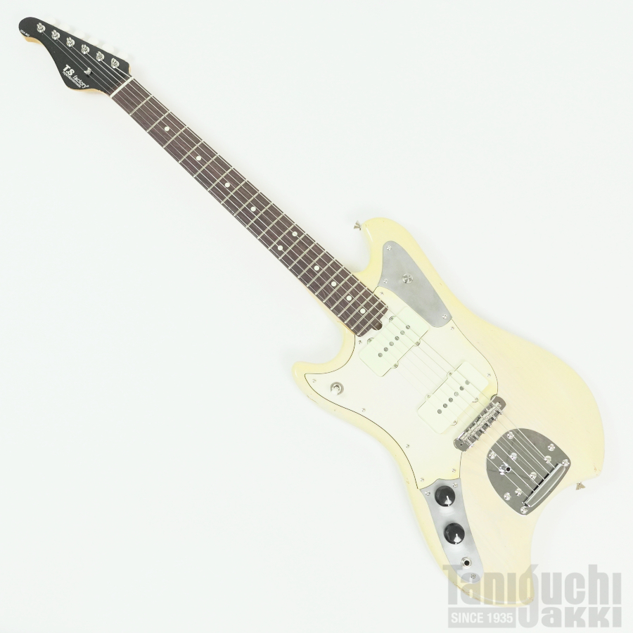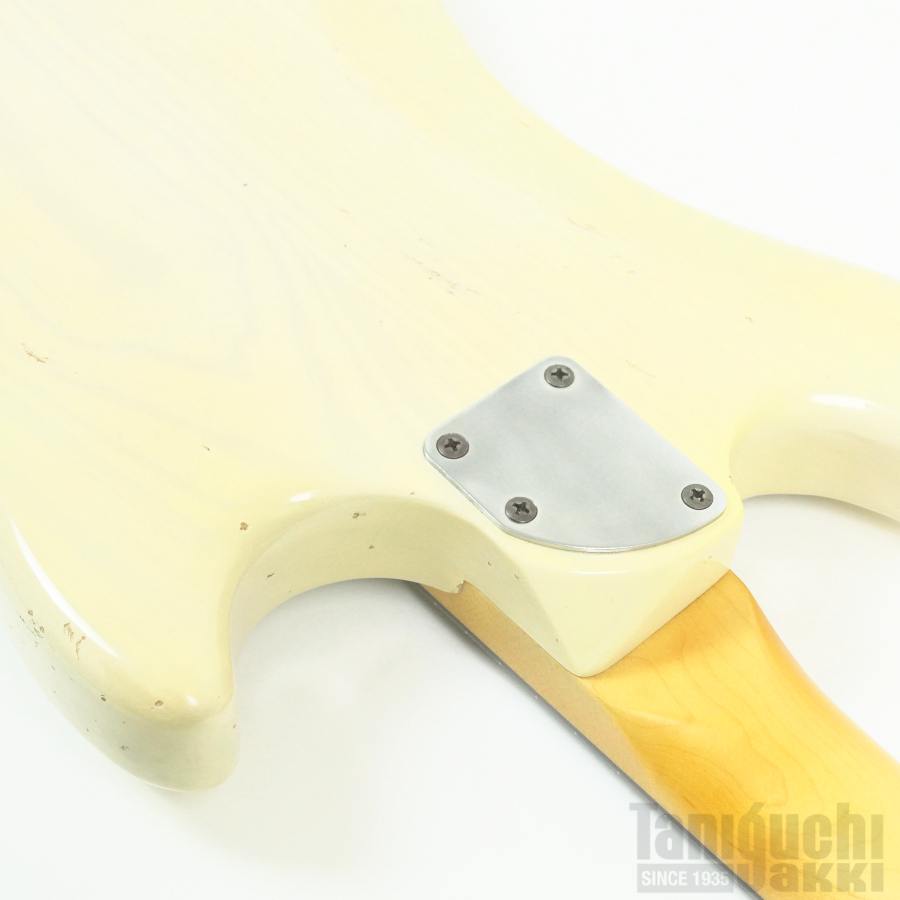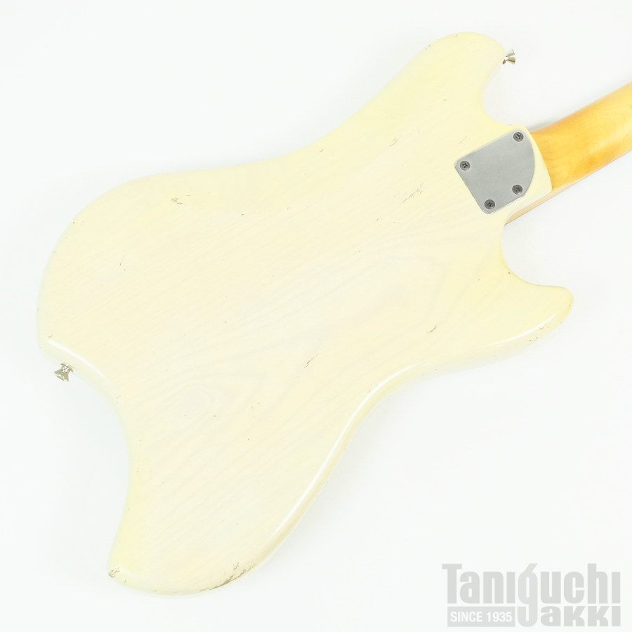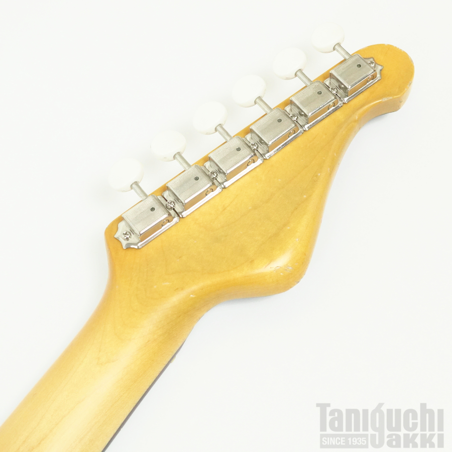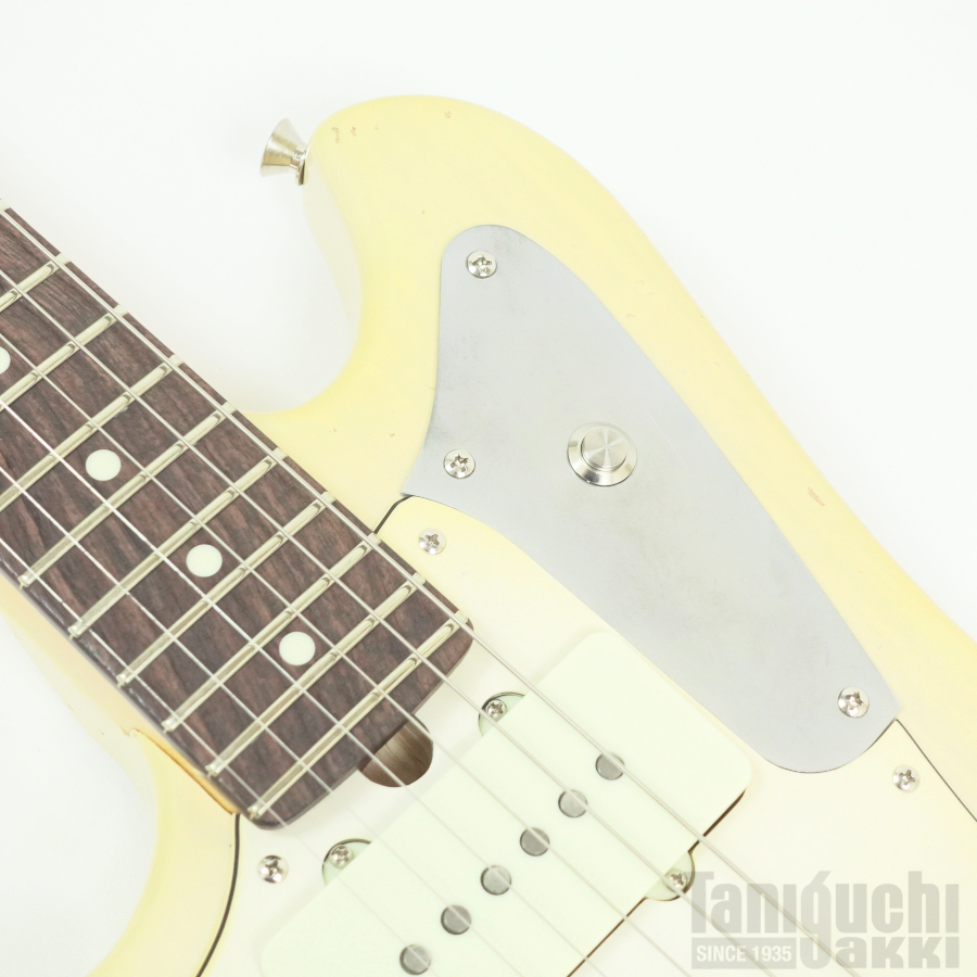 本機は ジャズマスターPUとフローティング・トレモロ+ムスタング・タイプのブリッジ・サドルをフィーチュアした1本。ボディはライトアッシュ。長い時を経て黄変したかのようなブロンド・カラーに合わせて、ピックガードにも経年による色焼けを再現。程よいエイジド加工も相まったヴィンテージギターのような風合いがクールです。