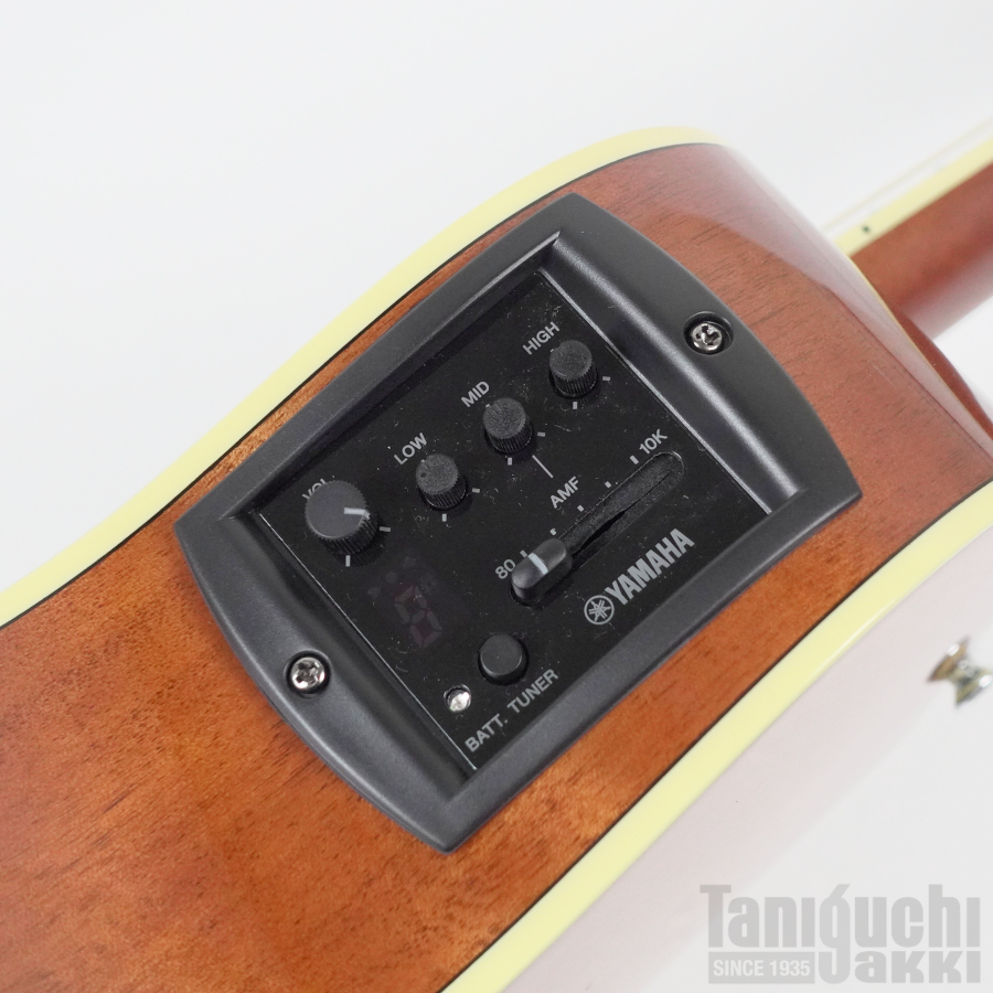 ブリッジ付近の表板裏面に貼り付けられた新開発コンタクト・ピックアップ。弦振動のみならず表板をはじめとしたボディ全体の鳴りをダイレクトに拾い上げ、ナチュラルなアコースティックサウンドを再現するヤマハ独自のシステムです。