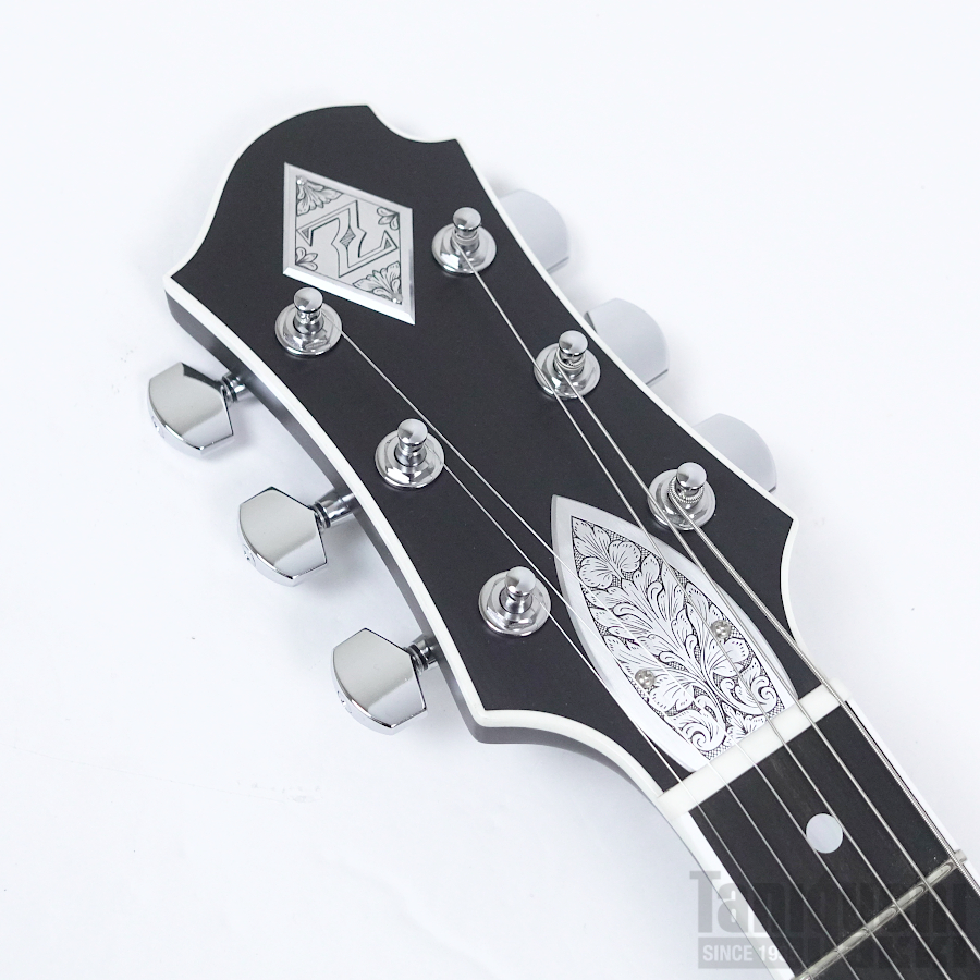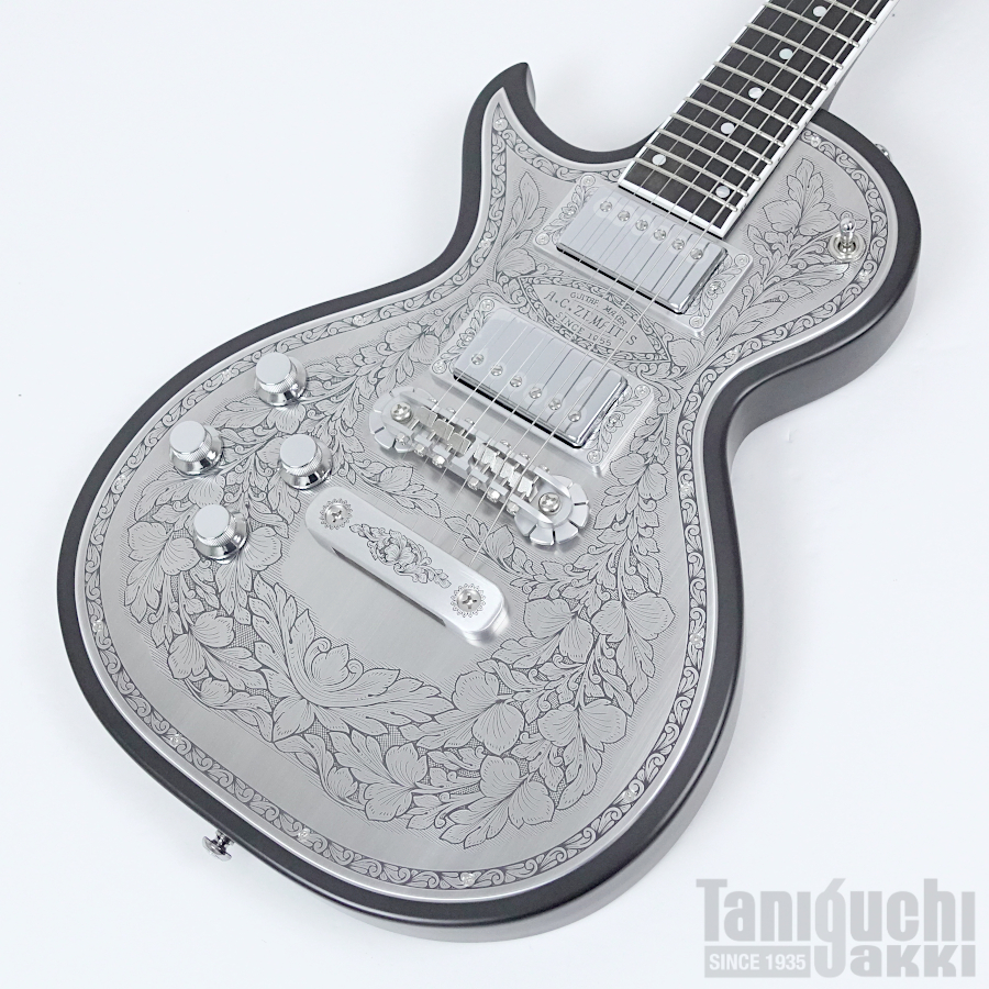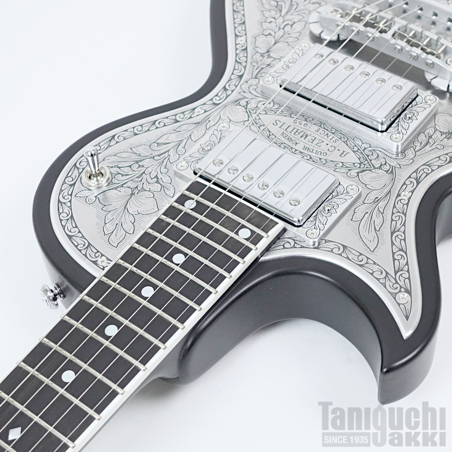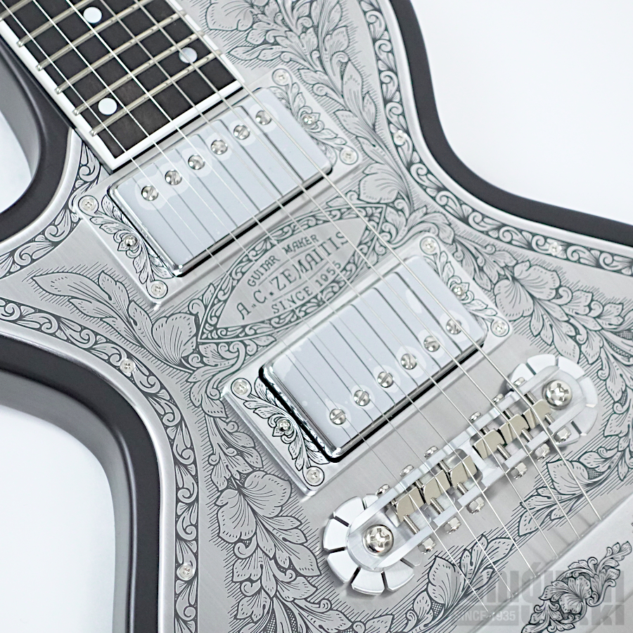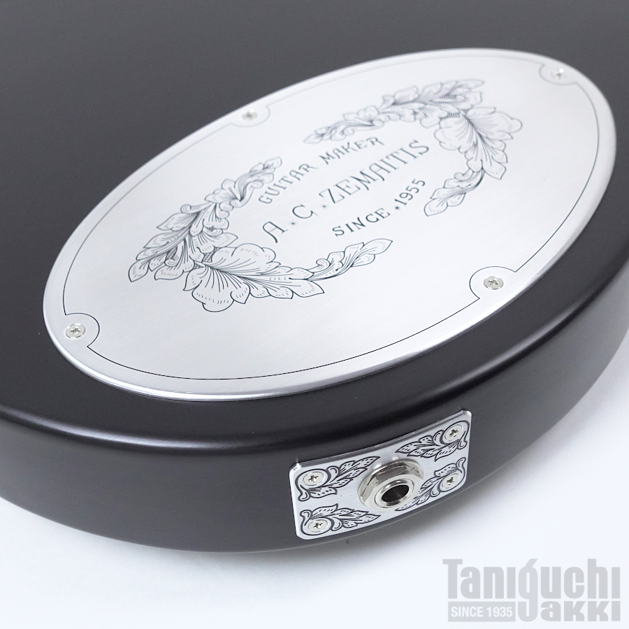 トップ&バックのプレートにはリーフ・スクロールと、伝統を示す「A.C.ZEMAITIS SINCE 1955」の文字が刻まれ、ヘッドのエンブレム、トラスロッド・カバー、テイルピース、ピックアップ・リング、アウトプット・ジャック・プレートなどのパーツに至るまで彫金を施したクラシックなルックスが特徴です。